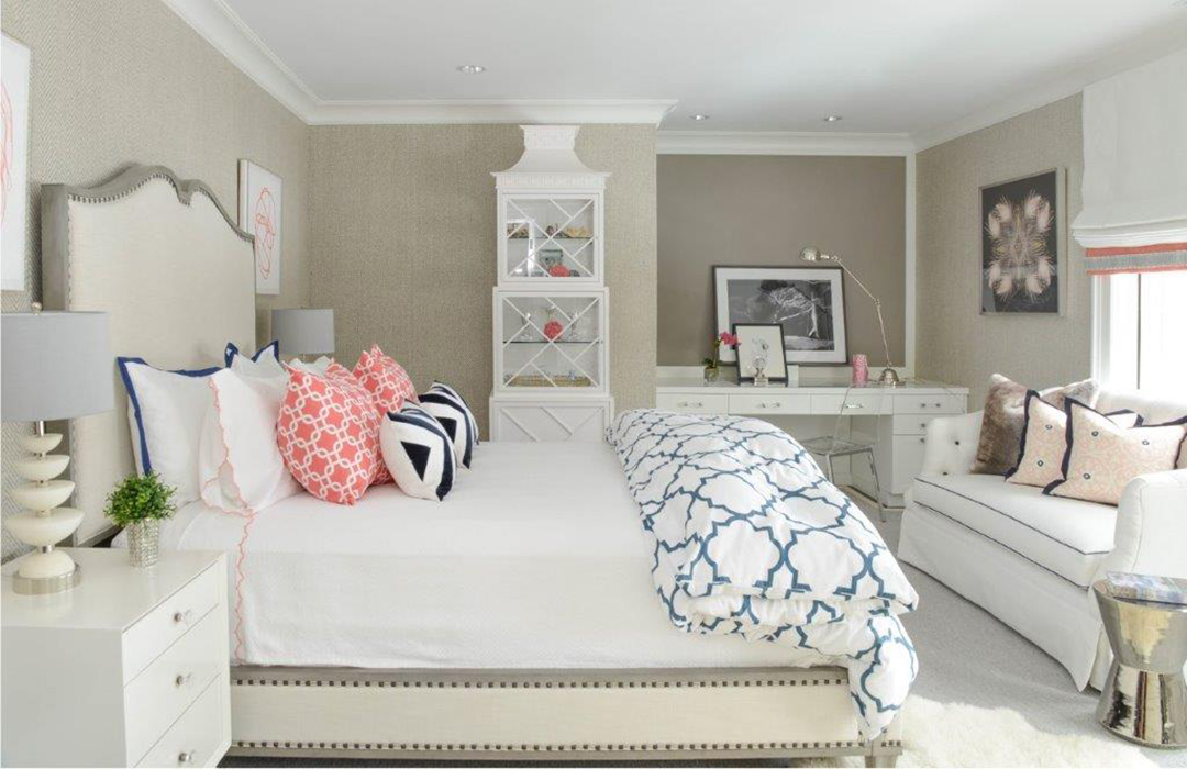 Neutral palates of three colors such as ivory, camel, and grey or blue, white, and camel are wonderful as they create a timeless interior. Adding punch with throw pillows and bedding are a great way to incorporate bold colors and patterns into a room. These elements can always be changed out to create a more sophisticated space as the base of neutrals is existing.
