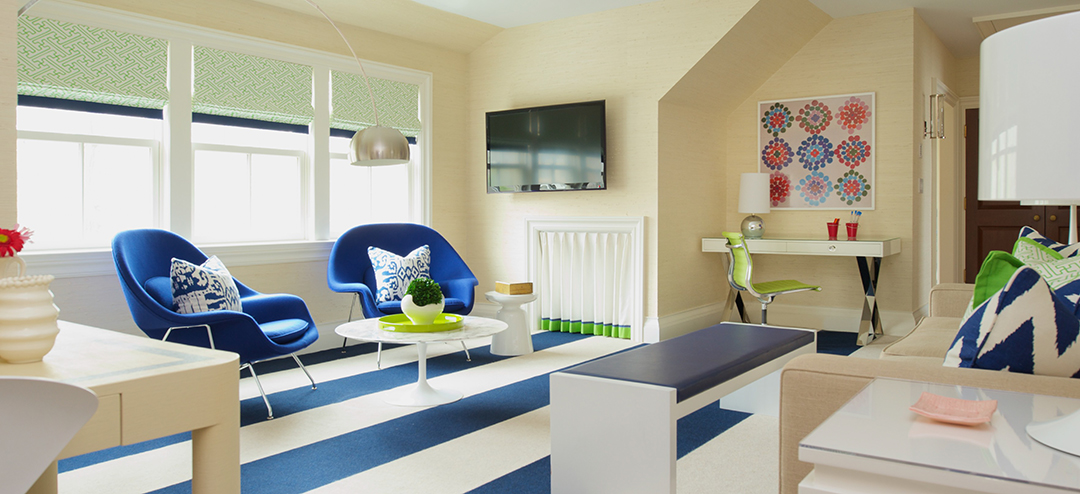 It is difficult to decide whether wood floors or carpeting are the right fit for you. If you decide on wall to wall carpets, Stark has an outdoor collection which has durable fibers that makes cleaning easier and won’t look stained from high volume use. Carpets with color blocking or patterns in neutral warm colors or monochromatic hues add depth and light to a space. This can transition from youthful to a more sophisticated mood depending on the fabrics that are upholstered on furniture.